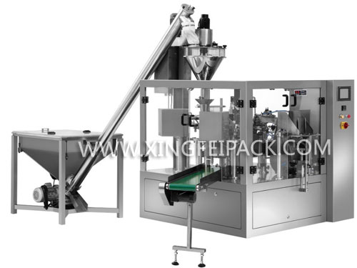 旋轉式給袋式自動(dòng)包裝機適用于平面袋,自立袋,拉鏈袋等各種形狀的熱封的復合袋.