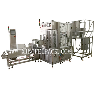 包裝流程(工位分布):1)上袋—2)色帶(噴碼)打碼(選項)—3)開(kāi)自立袋底—4)開(kāi)袋口—5)一次充填—6)二次充填(選項或者備用)—7)熱封口(同時(shí)排氣)—8)冷封口和產(chǎn)品輸出。